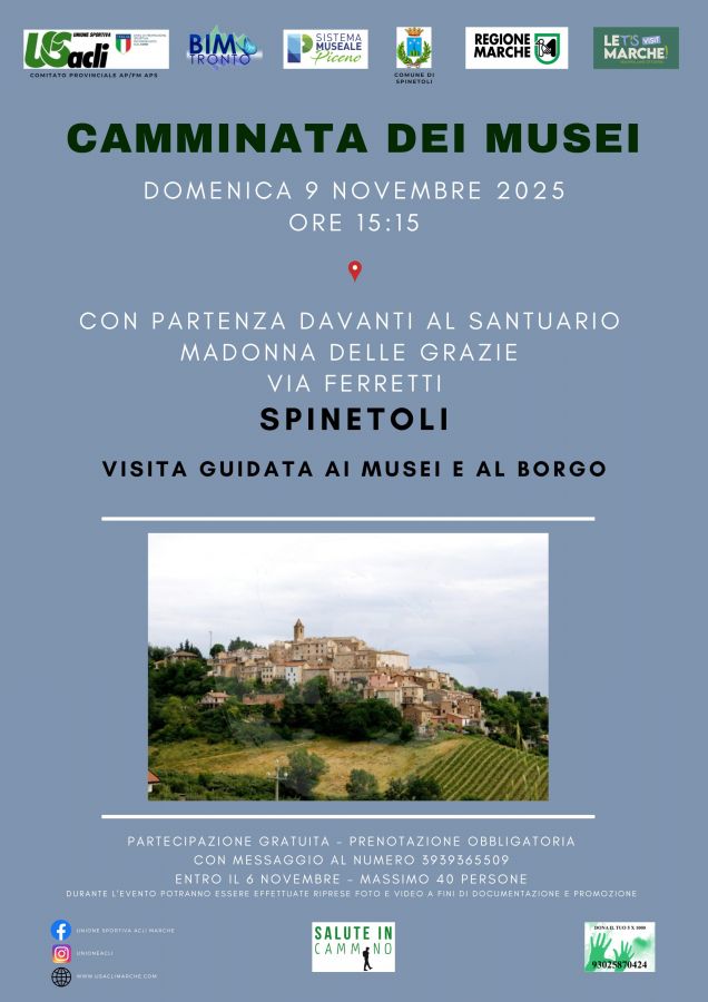 Domenica 9 Novembre, Spinetoli sarà protagonista di un pomeriggio dedicato alla scoperta del patrimonio culturale locale, grazie a una nuova tappa del progetto "Camminata dei musei". L'iniziativa, che si svolgerà dalle 15,15 alle 18 circa circa, è promossa dalla U.S. Acli provinciale di Ascoli Piceno/Fermo con il sostegno del Bim Tronto e della Regione Marche, in sinergia con il Sistema Museale Piceno e con il patrocinio del Comune di Spinetoli.