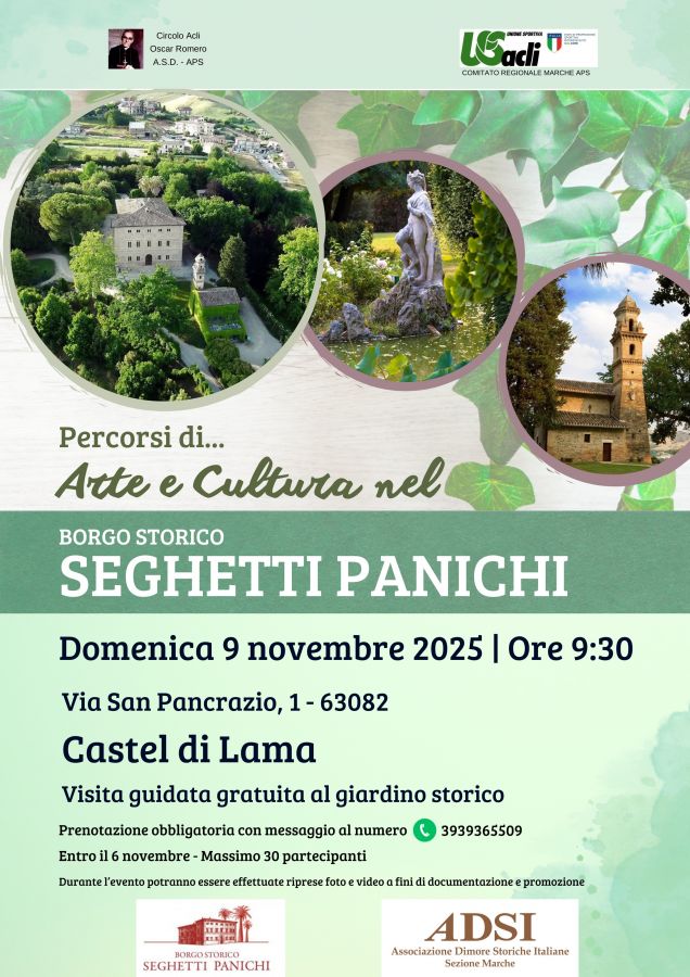 Domenica 9 Novembre si svolgerà l'iniziativa "Percorsi di arte e cultura nel Borgo Storico Seghetti Panichi", un appuntamento gratuito promosso dal Circolo Acli Oscar Romero ASD APS.