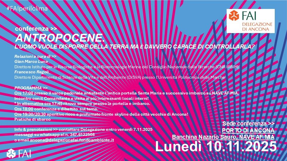 La Delegazione di Ancona interpreta la campagna FAIperilclimalunedì 10 novembre 2025 a questa interessantissima CONFERENZA "ANTROPOCENE. L'UOMO VUOLE DISPORRE DELLA TERRA MA È DAVVERO CAPACE DI CONTROLLARLA?"