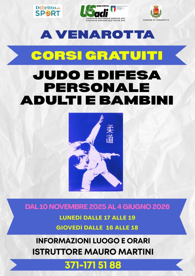 Prenderanno il via il 10 novembre le attività del progetto "Diritto allo sport" che prevedono, tra l'altro, la realizzazione di corsi gratuiti di judo a Venarotta.