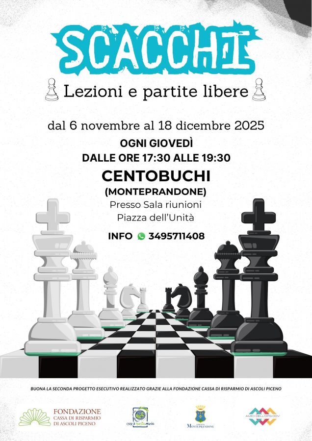 Giovedì 6 Novembre riprenderanno le lezioni per principianti e le partite libere per tutti di scacchi presso la sala riunioni comunale in Piazza dell'unità a Centobuchi di Monteprandone.