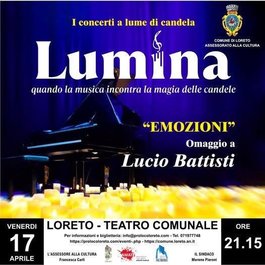Grande serata di musica e spettacolo il prossimo 17 aprile, alle ore 21.15, presso il Teatro Comunale di Loreto, con 'Lumina', suggestivo concerto a lume di candela dedicato a Lucio Battisti, dal titolo 'Emozioni'.