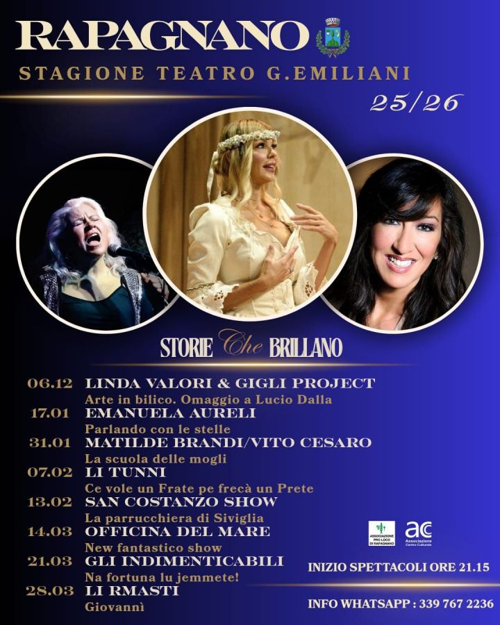 Con il titolo evocativo “Storie che brillano”, il Teatro G. Emiliani di Rapagnano accende i riflettori sulla nuova stagione teatrale 2025/2026, un cartellone pensato per far risplendere sul palcoscenico emozioni, sorrisi e riflessioni.
