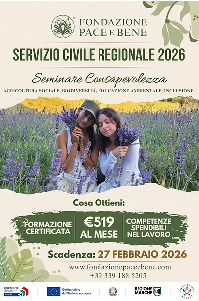 La Fondazione Pace e Bene promuove per l’anno 2026 il progetto di Servizio Civile Regionale “Seminare Consapevolezza”, un percorso pensato per offrire ai giovani un’esperienza formativa completa che coniuga impegno sociale, tutela dell’ambiente e crescita personale.