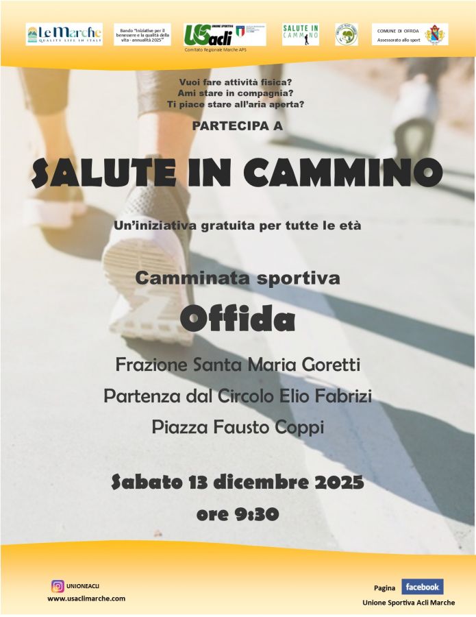 Sabato 13 dicembre, alle 9,30, nella frazione di Santa Maria Goretti, si svolgerà una camminata sportiva con esercizi ginnici della durata di un'ora circa.
