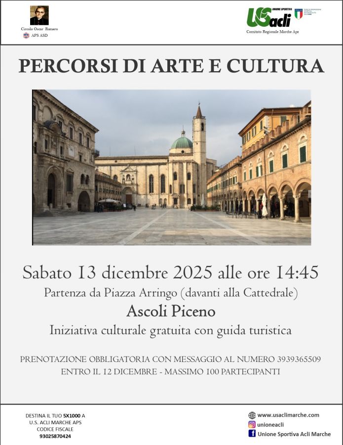 Sabato 13 dicembre si terrà ad Ascoli Piceno l'iniziativa "Percorsi di arte e cultura", con partenza alle ore 14,45 da Piazza Arringo, davanti alla Cattedrale.