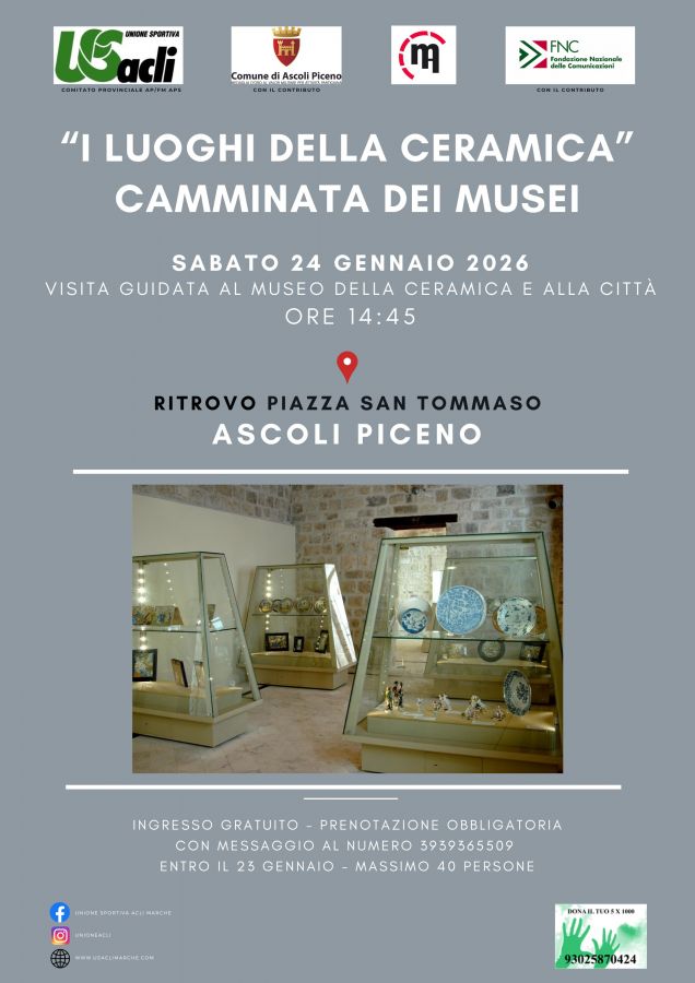 Il 24 gennaio, con la visita al Museo della ceramica e ad alcuni luoghi della città di Ascoli Piceno prenderà il via la dodicesima edizione del progetto "Camminata dei musei" promosso dall'Unione Sportiva Acli – Comitato provinciale Ascoli Piceno/Fermo.