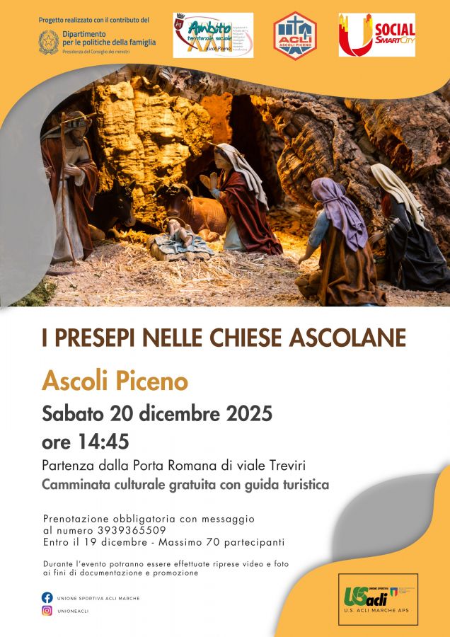 Sabato 20 dicembre, dalle ore 14:45 alle 18 circa, si svolgerà ad Ascoli Piceno un evento culturale gratuito promosso da Unione Sportiva Acli Marche: "I presepi nelle chiese ascolane".