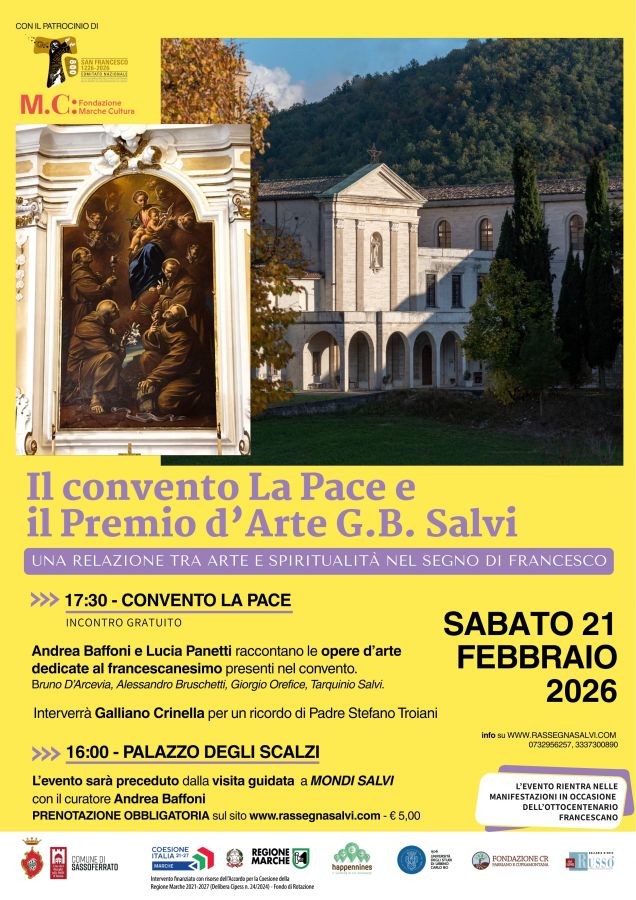 Giornata evento a Sassoferrato sabato 21 febbraio, nell’ambito della 74° Rassegna Internazionale d’Arte Premio G.B. Salvi. Un pomeriggio dedicato a San Francesconell’anno dell’Ottocentenario, con un’inedita visita alle opere custodite all’interno del convento La Pace.