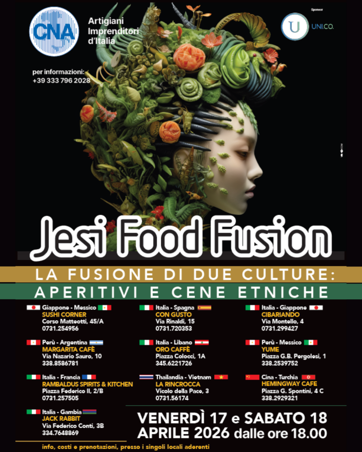 Dopo il successo del primo appuntamento, torna Jesi Food Fusion, l’evento che celebra l’incontro tra culture diverse attraverso aperitivi e cene etniche diffusi nei locali della città. L’appuntamento è per venerdì 17 e sabato 18 aprile 2026, dalle ore 18.00.