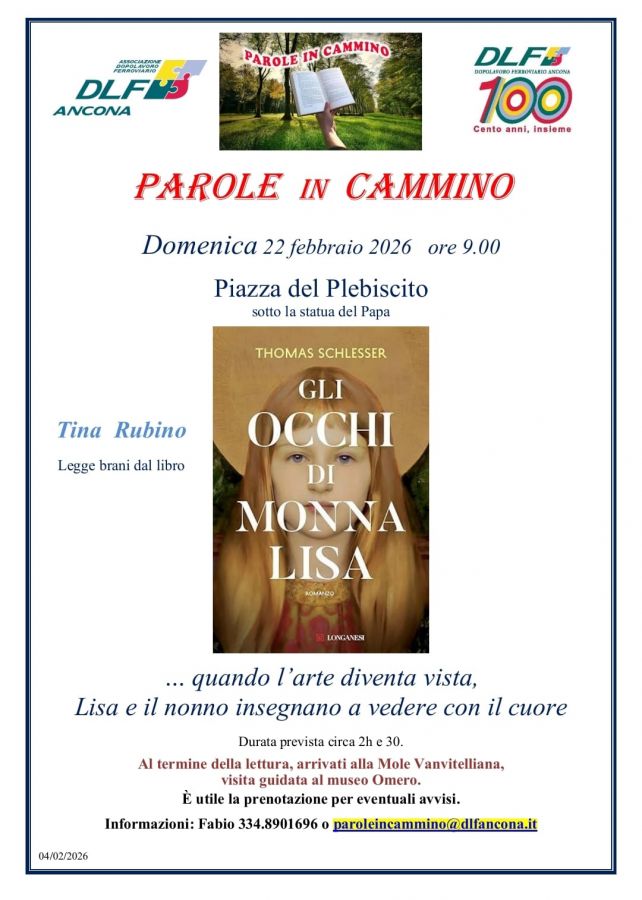 Domenica 22 il Dopolavoro Ferroviario di Ancona propone un appuntamento della serie " Parole in cammino" piccola camminata inframezzata da letture dal libro " Gli occhi di Monna Lisa" di Thomas Schlesser Ritrovo ore 9 in piazza del Plebiscito sotto la statua del papa.