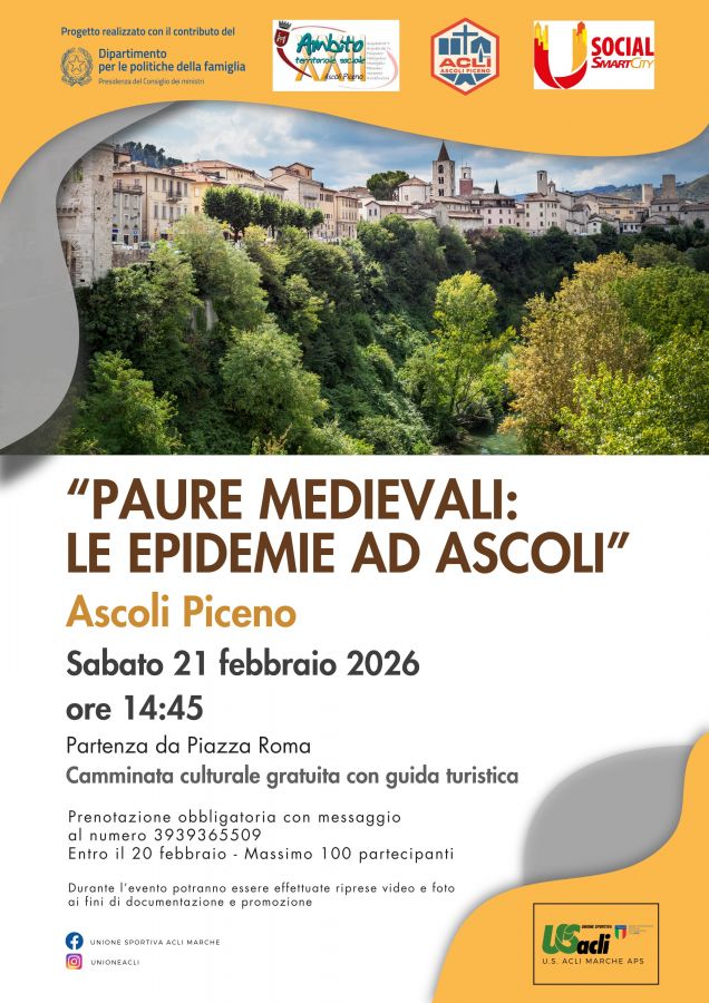 Sabato 21 febbraio, dalle ore 14:45 alle 17,30 circa, si svolgerà ad Ascoli Piceno un evento culturale gratuito promosso da Unione Sportiva Acli Marche Aps denominato "Paure medievali: le epidemie ad Ascoli".