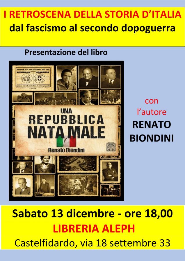 I retroscena della storia d'Italia dal fascismo al secondo dopoguerra; è questo il titolo dell'incontro previsto sabato 13 dicembre ore 18 alla libreria Aleph di Castelfidardo, nel quale verrà ri-presentato uno straordinario libro-inchiesta: "Una Repubblica nata male.