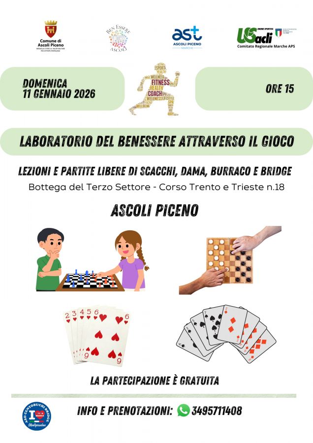 Il Comune di Ascoli Piceno, insieme all'US Acli Marche APS, nell'ambito dell'iniziativa "Fine settimana del Benessere" promuove un pomeriggio dedicato al benessere personale e alla socializzazione attraverso il gioco. L'iniziativa, intitolata "Laboratorio del Benessere attraverso il Gioco", si svolgerà domenica 11 gennaio 2026 alle ore 15 presso la Bottega del Terzo Settore in Corso Trento e Trieste 18.