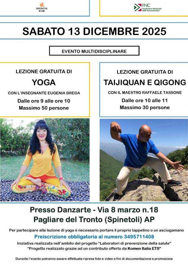 Sabato 13 dicembre a Spinetoli si svolgerà un evento multidisciplinare. L'appuntamento è fissato dalle ore 9 alle ore 11 a Pagliare del Tronto, presso la sede Danzarte in via 8 Marzo, e sarà aperto a persone di tutte le età. L'iniziativa è organizzata dalla Cooperativa DLM con il sostegno della Fondazione Nazionale delle Comunicazioni e di Komen Italia ETS.