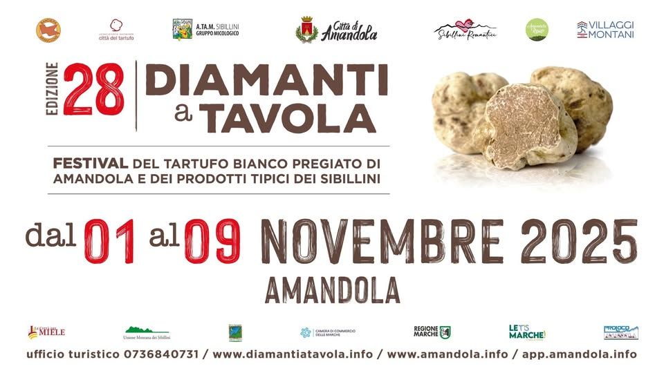 Torna ad Amandola l’appuntamento più atteso dell’autunno: Diamanti a Tavola, il Festival del Tartufo Bianco Pregiato dei Sibillini e dei prodotti tipici locali, giunto alla sua 28ª edizione.