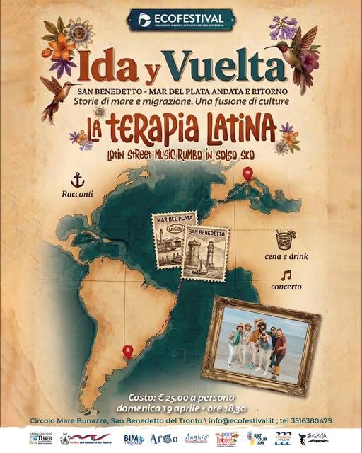 IDA Y VUELTA. San Benedetto del Tronto Mar del Plata andata e ritorno Due città, un mare, infinite storie. Una serata tra racconti di emigrazione, piatti dell'Adriatico e la musica travolgente de La Terapia Latina. Domenica 19 aprile - Circolo Mare Bunazze | Ore 18.30