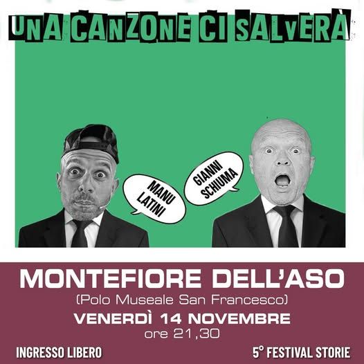 Venerdì 14 novembre alle 21.30 al Polo Museale San Francesco a Montefiore dell’Aso, Gianni Schiuma e Manu Latini ci accompagnano in un viaggio tra musica, ricordi ed emozioni.
