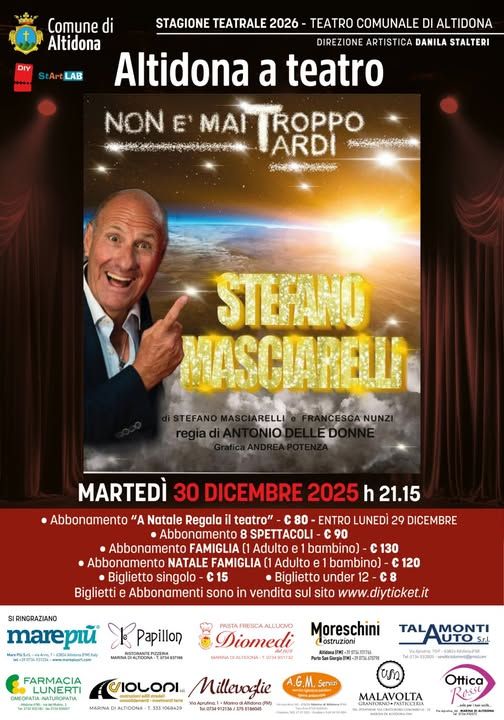 Avvio ufficiale della decima stagione teatrale all’Auditorium “Giusti” di Sant’Elpidio a Mare: dopo il gran galà della scorsa settimana, il luogo che è cuore pulsante dell’associazione Lagrù ospiterà sabato 20 dicembre alle 21.15 il primo spettacolo del cartellone 2025-2026. RINVIATO AL 3 GENNAIO CAUSA LUTTO DI UN COMPONENTE DELLO STAFF