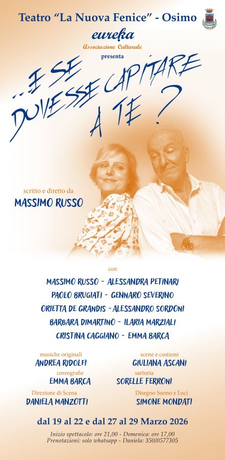 L'omaggio di Massimo Russo alla grande tradizione della commedia italiana con le musiche del M° Andrea Ridolfi In anteprima regionale al Teatro La Nuova Fenice di Osimo, giovedì 19 marzo alle ore 21 va in scena la brillante commedia musicale "E se dovesse capitare a te?", scritta, diretta e interpretata da Massimo Russo, con musiche originali del M° Andrea Ridolfi, direttore d'orchestra RAI e autore di colonne sonore per fiction di grande successo quali Mina Settembre, La Fuggitiva, I Bastardi di Pizzofalcone, I casi di Teresa Battaglia...