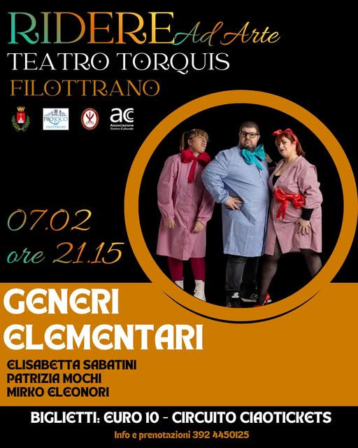 GENERI ELEMENTARI. Tre comici. Tre sguardi diversi. Un unico obiettivo: far ridere. Elisabetta Sabatini, Patrizia Mochi e Mirko Eleonori portano in scena uno spettacolo esilarante che unisce gli anni ’90 alla modernità, tra amicizie, ritorni, manie quotidiane e consigli assurdi.