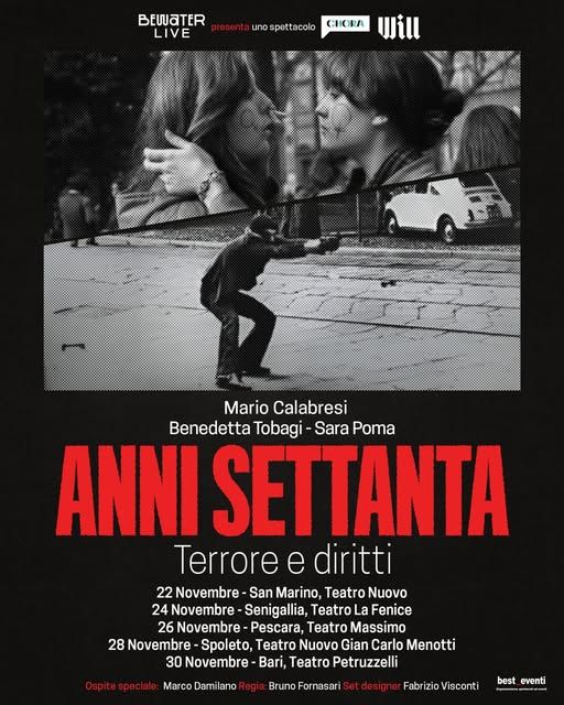”Anni Settanta. Terrore e Diritti” è un progetto teatrale scritto da Mario Calabresi, Benedetta Tobagi e Sara Poma, con un racconto inedito e personale di Marco Damilano e con la regia di Bruno Fornasari. I protagonisti si alterneranno sul palco per raccontare un periodo decisivo della storia del nostro Paese e per dare voce a una riflessione profonda e potente su un decennio segnato da drammatici attentati e fondamentali conquiste sociali e civili