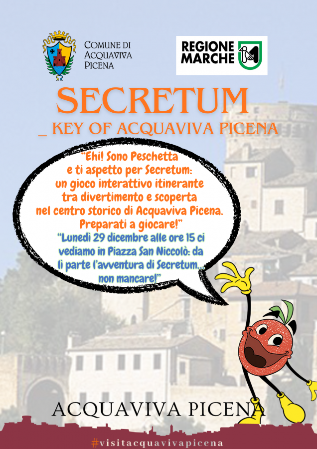 Lunedì 29 dicembre, con appuntamento alle ore 15 in Piazza San Niccolò, prende ufficialmente il via "Secretum – The Key of Acquaviva Picena", un innovativo gioco interattivo itinerante pensato per valorizzare il centro storico del borgo. A guidare i partecipanti in questa esperienza sarà Peschetta, personaggio simbolo che accompagnerà grandi e piccoli alla scoperta della storia e delle bellezze di Acquaviva Picena.