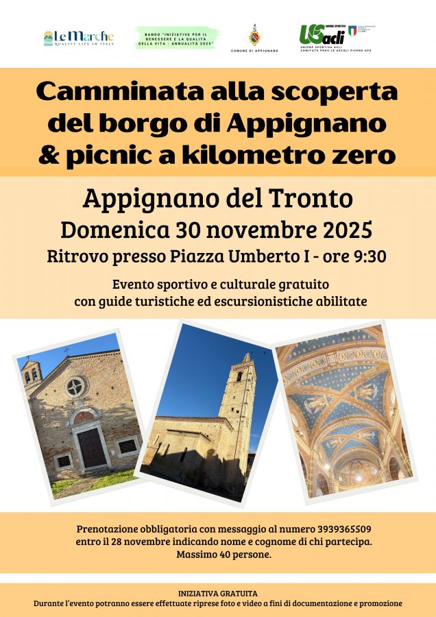 Domenica 30 novembre ad Appignano del Tronto si svolgerà una camminata nel borgo, con guide turistiche ed escursionistiche abilitate, con al termine un picnic a chilometro zero. L'iniziativa è organizzata dall'amministrazione comunale in collaborazione con U.S. Acli provinciale Aps e con il sostegno della Regione Marche, nell'ambito del bando