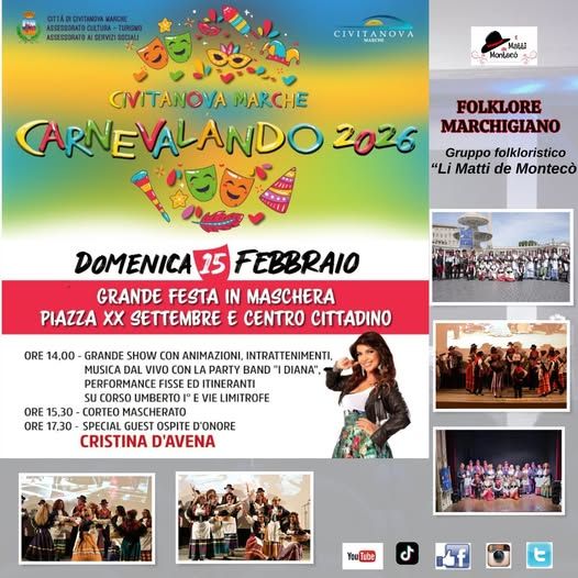 Il Carnevale 2026 di Civitanova Marche, prenderà il via domenica 15 febbraio nel centro cittadino con la tradizionale sfilata dei gruppi mascherati. La festa proseguirà martedì 17 febbraio a Civitanova Alta, portando l’allegria anche nel cuore storico della città.