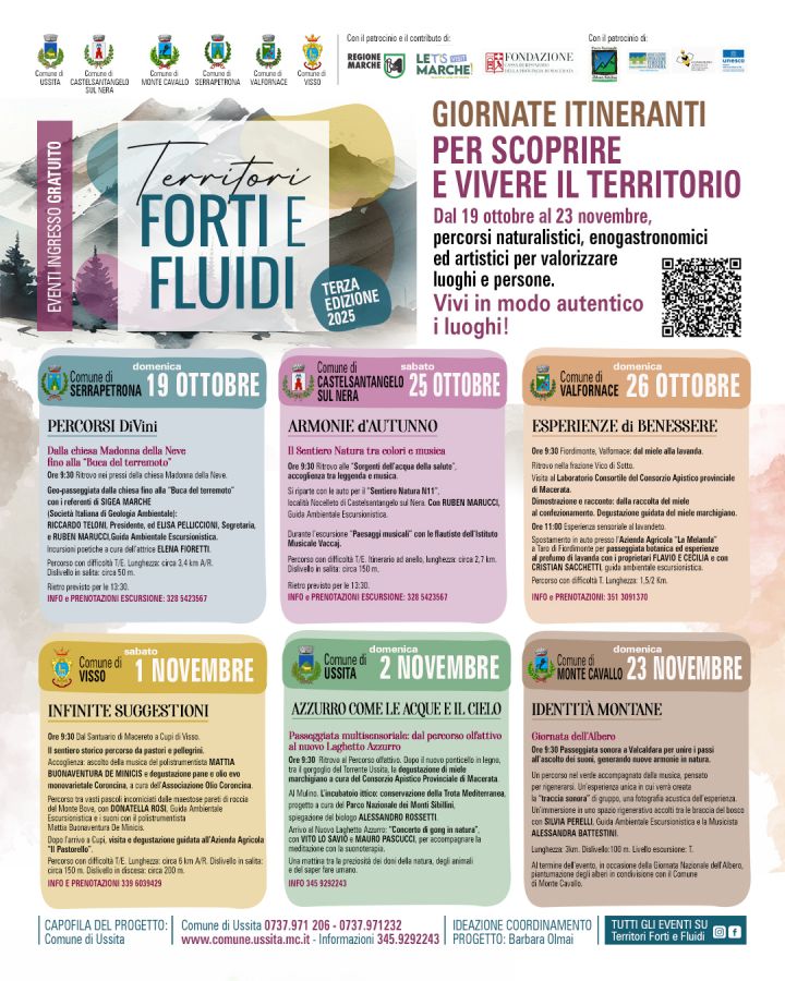 Al via la prima parte della terza edizione di "Territori Forti e fluidi. Giornate itineranti per scoprire e vivere il territorio". Protagonisti i comuni di Ussita, capofila del progetto, Castelsantangelo sul Nera, Monte Cavallo, Serrapetrona, Valfornace, Visso. Dal 19 ottobre al 23 novembre, percorsi naturalistici, enogastronomici ed artistici per valorizzare luoghi e persone.