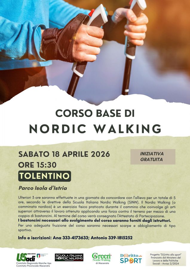 Sabato 18 aprile a Tolentino si svolgerà un corso base gratuito di Nordic Walking. L'iniziativa è organizzata da U.S. Acli Marche APS, U.S. Acli provinciale Macerata, Green Nordic Walking di Macerata e Scuola Italiana di Nordic Walking, nell'ambito del progetto "D(i)ritto allo sport" che ha già visto la realizzazione di un analogo corso a San Firmano di Montelupone.