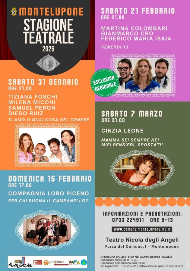 13 spettacoli da novembre ad aprile di cui 6 in abbonamento compongono il variegato mosaico della stagione 2025-26 del Teatro Piermarini di Matelica nata dalla rinnovata collaborazione tra il Comune e l’AMAT, con il contributo della Regione Marche e del MiC.
