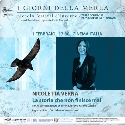 L’ultimo appuntamento, “La storia che non finisce mai”, sarà domenica 1 febbraio alle ore 17,30 presso il Cinema Italia, con la scrittrice Nicoletta Verna , autrice del romanzo rivelazione del 2025 "I giorni di Vetro" con il quale ha vinto numerosi premi tra cui il Premio di letteratura dell’Unione Europea 2025. La Storia come scandalo, memoria e riscatto vedrà la partecipazione dell'attrice Moira Ciccioli e della musicista e cantante @serenaabrami_ Serena Abrami, voce inconfondibile e meravigliosa.