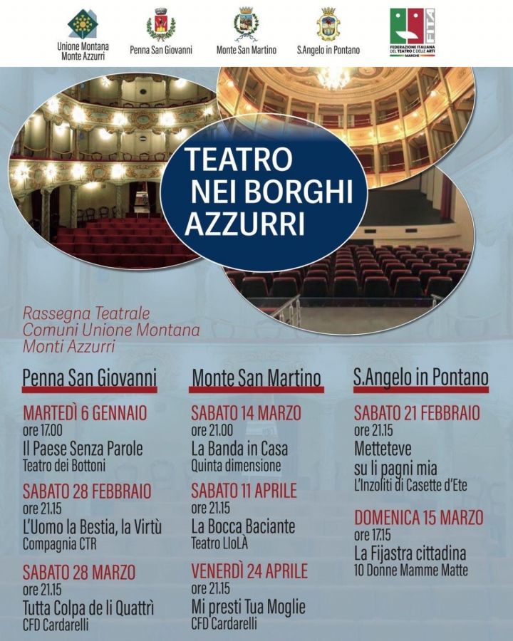 Promuovere l’arte e la cultura come strumenti di crescita civile, aggregazione sociale e valorizzazione del territorio: è da questa visione condivisa che nasce la nuova rassegna teatrale diffusa promossa da FITA Marche - Federazione Italiana del Teatro e delle Arti in collaborazione con l’Unione Montana dei Monti Azzurri e i comuni di Monte San Martino, Penna San Giovanni e Sant'Angelo in Pontano.