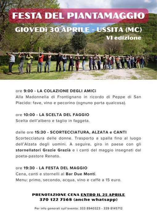 Giovedì 30 aprile 2026 si rinnova a Ussita, nel cuore del Parco nazionale dei Monti Sibillini, la festa del Piantamaggio, un antico rito pagano, inno alla fertilità e saluto alla primavera. Il Piantamaggio ussitano è un rito collettivo e sociale, ritornato in vita nel 2019 grazie a un gruppo di abitanti che ne conservano ancora memoria, con il supporto organizzativo dell’associazione C.A.S.A. e della Proloco Ussita 7.1.