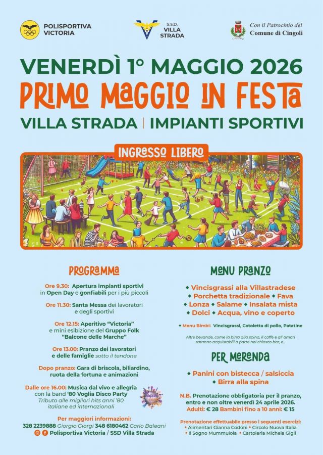 Il primo maggio presso gli impianti sportivi di Villastrada di Cingoli con ricco menù giochi vari ,musica anni 70/80/90 e un'occasione per visitare il borgo dei borghi 2026 per eventuali prenotazioni rivolgersi ai numeri nella locandina