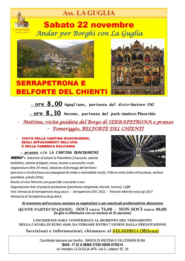 Serrapetrona e la Magia degli Appassimenti Sei pronto per una gita che unisce storia, bellezza e sapori unici? Ti invitiamo a unirti a noi a Serrapetrona, l'incantevole borgo marchigiano, in occasione dell'iniziativa annuale "Andare per Borghi"!
