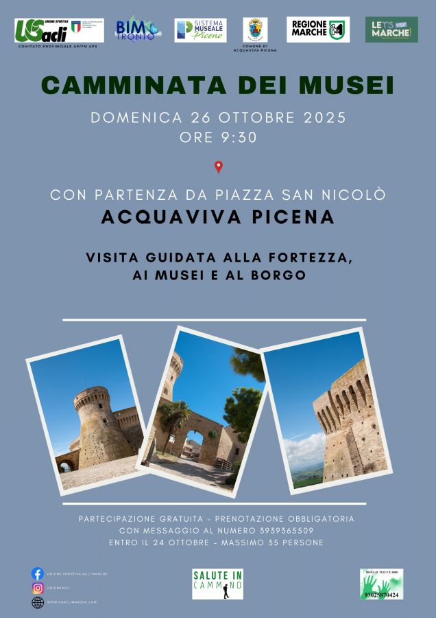 L'iniziativa si svolgerà ad Acquaviva Picena e prevede la visita del borgo, della Fortezza medievale, del Museo La fortezza nel tempo e del Museo La Pajarola.