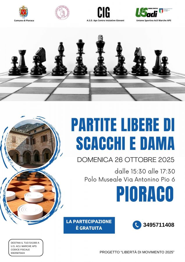 Domenica 26 ottobre, nei locali del Polo Museale in via Antonino Pio 6 a Pioraco, sono in programma, dalle 15,30 alle 17,30, partite libere di scacchi e dama.