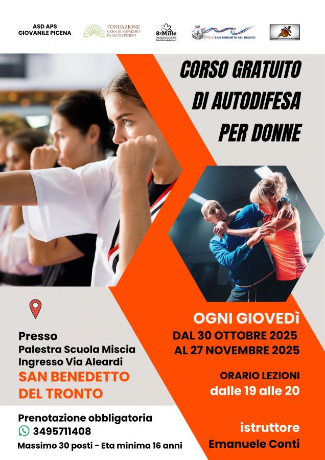 Dal 30 ottobre al 27 novembre, ogni giovedì dalle 19 alle 20, si terrà un nuovo corso gratuito di autodifesa per donne presso la palestra della Scuola Miscia (ingresso da via Aleardi) a San Benedetto del Tronto.